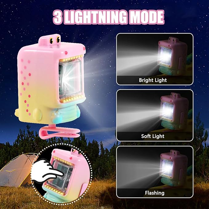 - 𝐓𝐡𝐫𝐞𝐞 𝐈𝐥𝐥𝐮𝐦𝐢𝐧𝐚𝐭𝐢𝐨𝐧 𝐌𝐨𝐝𝐞𝐬 These funny dino-shaped headlights for adult shoes offer three lighting modes - bright light, soft glow, and flashing. The convenient switch on the light head allows for easy adjustments, ensuring the perfect illumination for any situation.