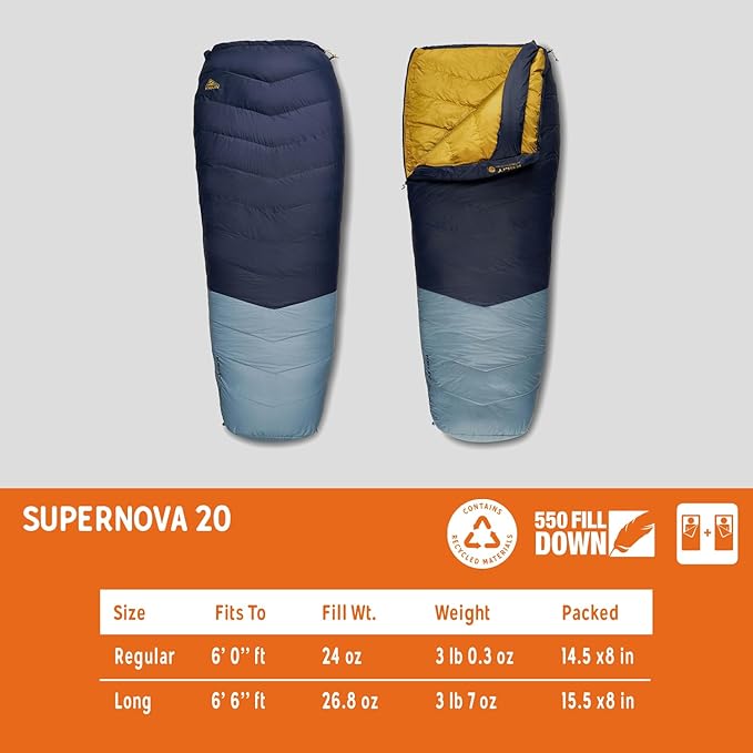 • THE BAG: The Supernova is a Super Sleeping Bag that provides backcountry performance in a roomier shape to fit a wide range of body types and sleep positions, insulated with 550 fill power down for premium heat retention and compressibility