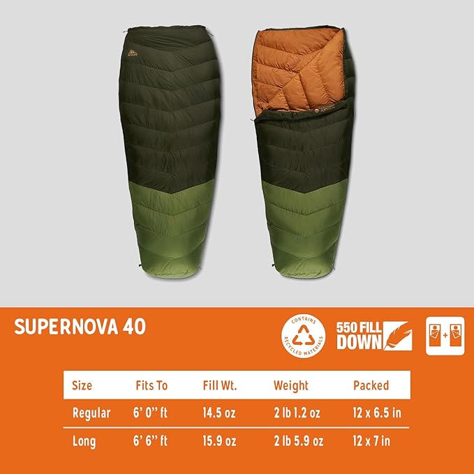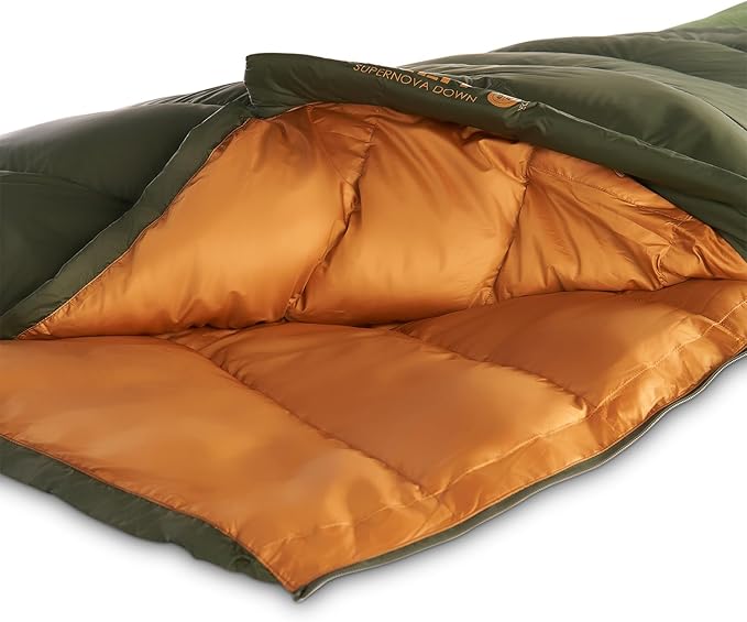 - THE BAG: The Supernova is a Super Sleeping Bag that provides backcountry performance in a roomier shape to fit a wide range of body types and sleep positions, insulated with 550 fill power down for premium heat retention and compressibility