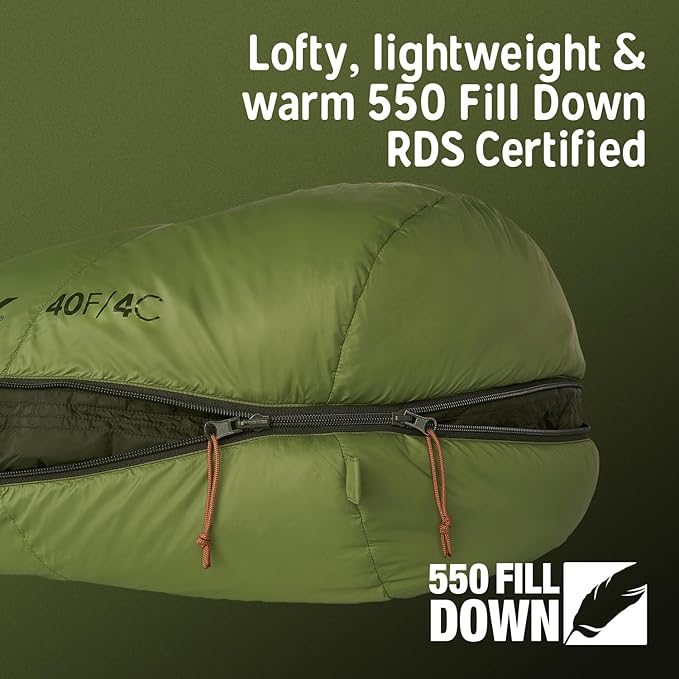 - THE SPECS: 40 Degree Regular – Fits to 6 ft., 76 x 33 in., 15 oz. fill weight, 2 lbs. 1 oz. packed weight, 12 x 6 in. packed size. 550 100% gray duck down, RDS Certified.