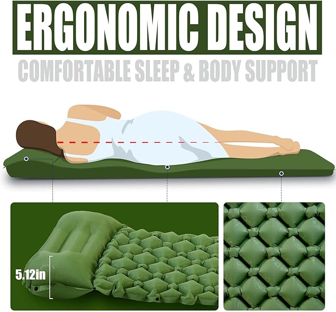- 【Superior Comfort】: using our self inflating sleeping pad you can enjoy a restful night's sleep with its comfortable 5.12-inch pillow, designed with your comfort in mind, this camping sleeping pad features a built-in pillow to provide extra support for your neck and head