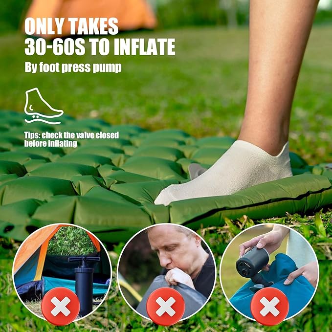 - 【★★★Rapid Inflation & Deflation★★★】: this sleeping pad for camping inflates in just 30~60S, Unlike traditional inflation methods such as electric air pumps, manual air pumps, and sprays, it uses your foot to press the air pump to complete the inflation. Deflates swiftly for convenient packing and storage, Women, children, and the elderly can easily complete it, even if there is exhaust gas, it can be easily completed in a few minutes