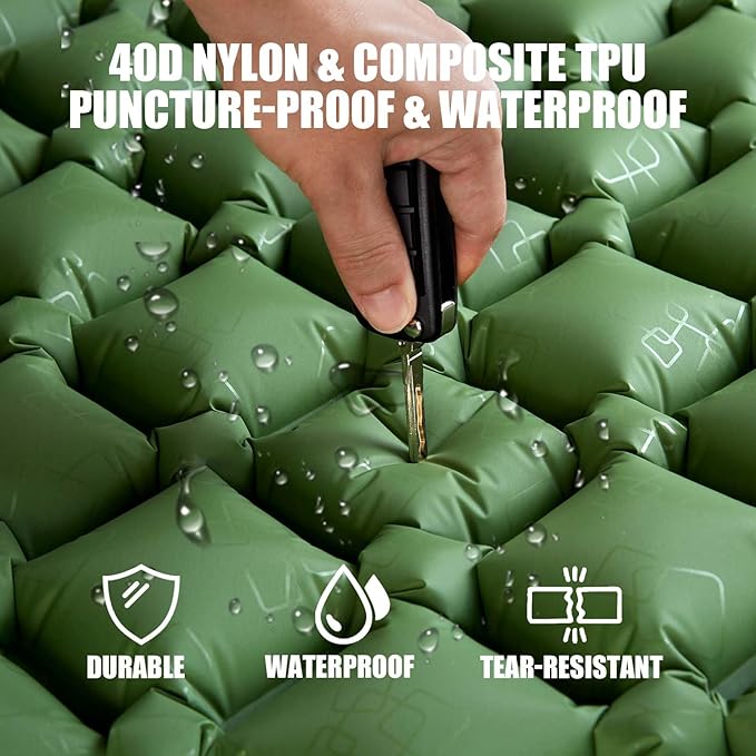 - 【Premium Materials & Durable Construction】: this inflatable sleeping pad with 40D nylon polyester + multi-layer TPU offers exceptional durability and water resistance, ensuring longevity and reliability on all your adventures. The robust construction ensures it can handle rough terrain without sacrificing comfort