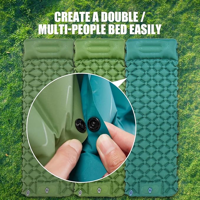- 【Twin-Person Design & Multiple Connections Available】: There are connection buttons on both sides of the air mattress, so you can connect multiple air mattresses without gaps. Just close the button to instantly create a new double sleeping mat, designed to accommodate two/multiple people comfortably, easily connectable with additional camping mattress pad for larger groups or families