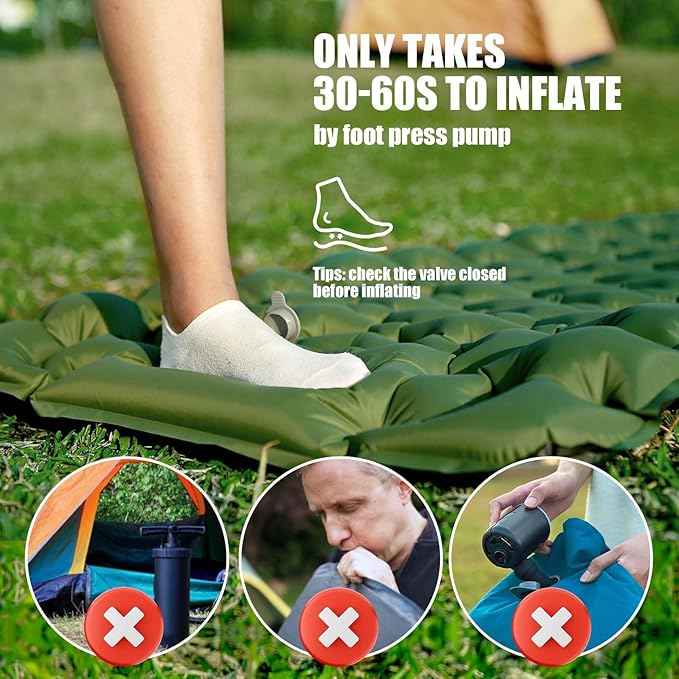 - 【▲▲▲Quick Inflation▲▲▲】: inflate your sleeping pad swiftly within 30 to 60s, with a convenient foot pump design, you can easily inflate the camping sleeping pad without the need for any additional equipment, and also avoids introduce moisture into the interior by mouth blowing. And the deflation valve has the double-decked design with a multi-functional which is used for fast deflating