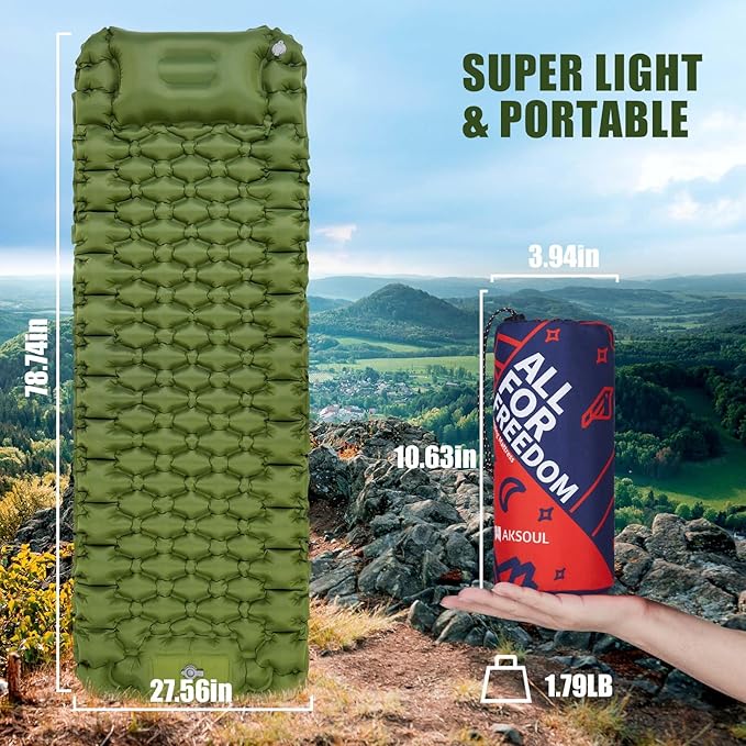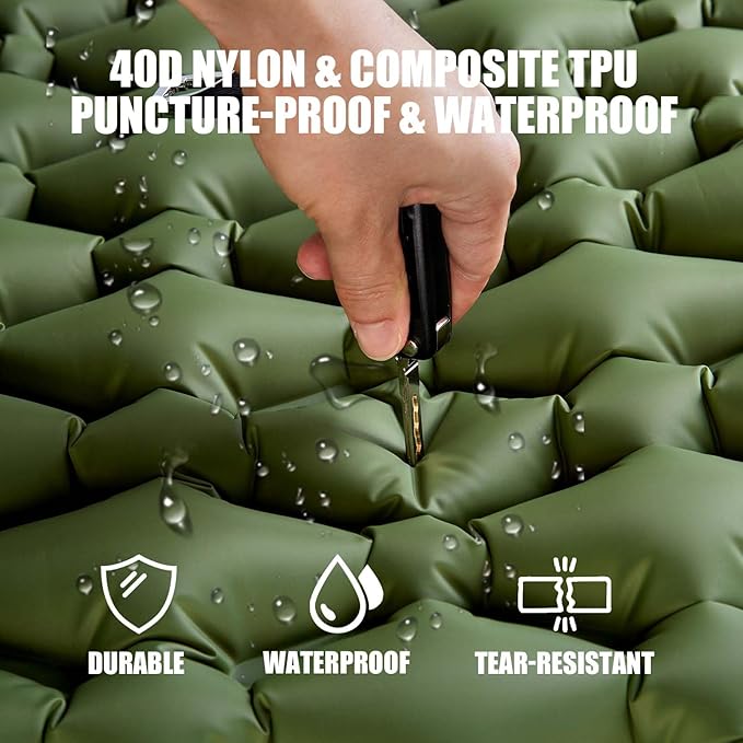 - 【Durable Design】: the camping mat crafts from 40D nylon with TPU coating, our camping pads for sleeping is both waterproof and puncture-proof, ensuring it withstands rugged outdoor conditions for long-lasting use, With the special inner I-beam structure and thermoforming sealed edges, it bears weight up to 440lb/200kg, providing you with durability at every adventurous camping night