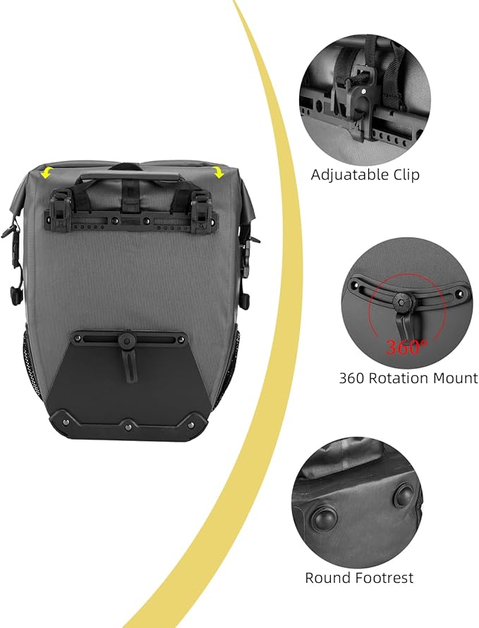 - THREE-POINT ATTACHMENT SYSTEM: Two movable buckles on the back of the bag help you adjust the bag to the right position according to your bike rack.The 360-degree rotatable bracket is used to secure the bag to the side bars to prevent the bag from bouncing out. It can be easily adjusted without additional tools which become a real quick release system.