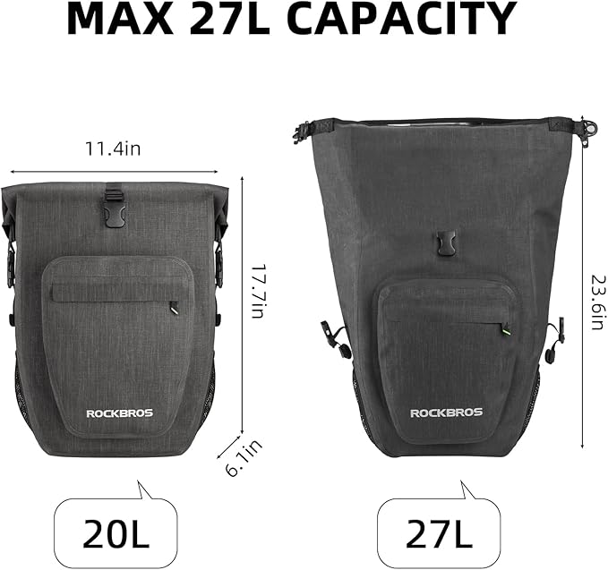- Max 27L LARGE CAPACITY: Exterior bungee cords (rain jacket,umbrella) + Interior main compartment together with mesh pockets. 27L capacity each bag can holds your change of clothes or some essentials for the cycling trip. The mesh pockets inside the bag can store some small items for easy access. Suitable for multiple occasions like outdoor long distance rides, daily commute or transport groceries.