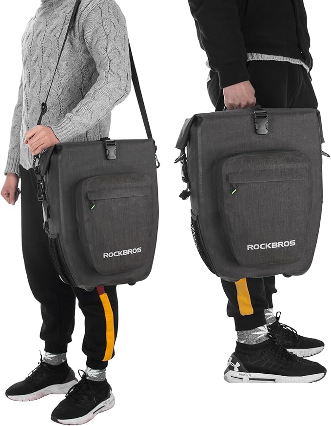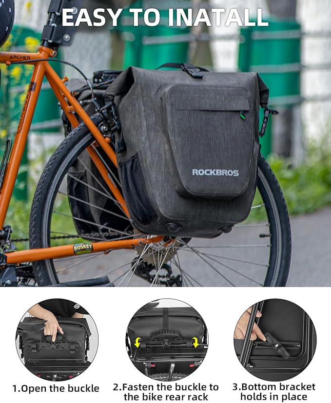 - HUMANIZED DESIGN: The fixing plate on the back of the bag effectively prevents the pannier bag from getting into the bike spokes. Roll up closure design be of more waterproof performance than traditional zippers,and it can help you easily access the personal belongings in the bag.