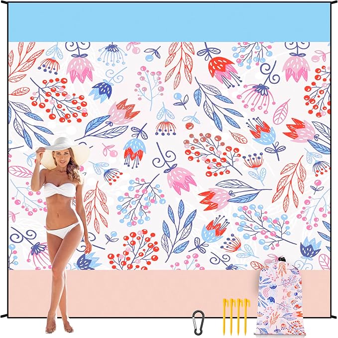 - 🌴Waterproof And Sandproof:Made nylon fabric,Waterproof and sandproof,breathable, heat-resistant, waterproof and skin-friendly,shake the sand off easily.The four corners of the beach mat have pockets, which can be put into the sand, the blanket can be put on the ground more flat, of course, can be inserted into the stakes, to increase the wind resistance.