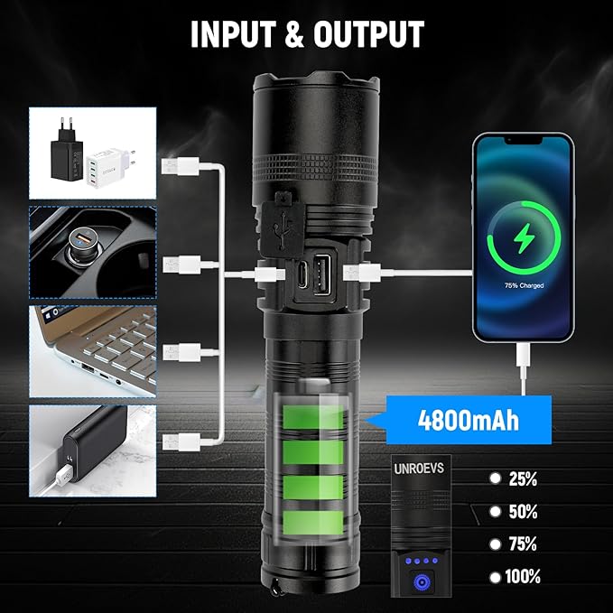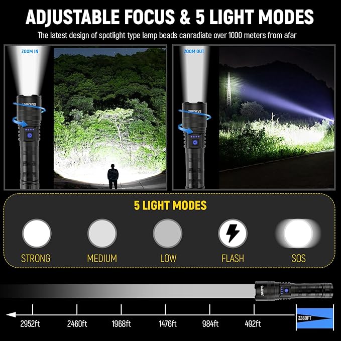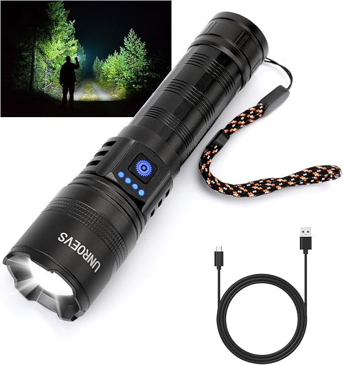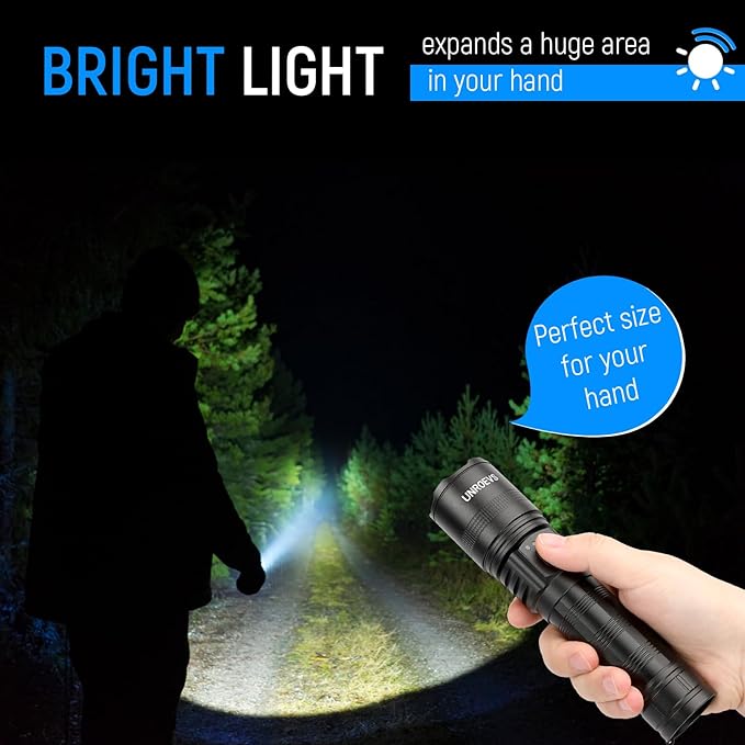 - Fashlights High Lumens: UNROEVS rechargeable flashlights are equipped with a super bright P70+ LED chip, to produce up to 3000 lumens brightness. With high powered flashlight, meeting your various illumination needs, lighting up to 1300ft² area or 1500ft distance, for emergencies, camping, hiking.