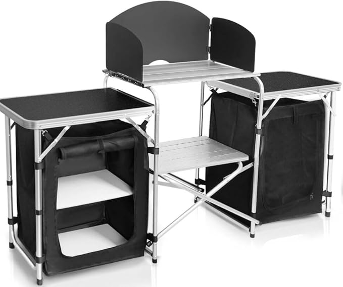 - Well-designed & Premium Material Camp Table - Steel windscreen on the countertop table blocks the wind for heat retention and ensures more effective burning. Aluminum material with PVC Coating makes the portable folding camp kitchen more durable.
