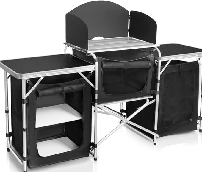 - Well-designed & Premium Material Camp Table - Steel windscreen on the countertop table blocks the wind for heat retention and ensures more effective burning. Aluminum material with PVC Coating makes the portable folding camp kitchen more durable.