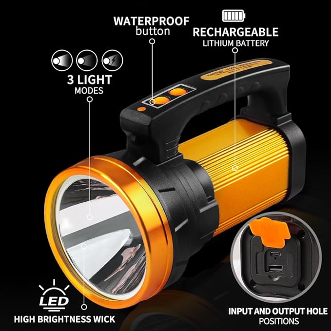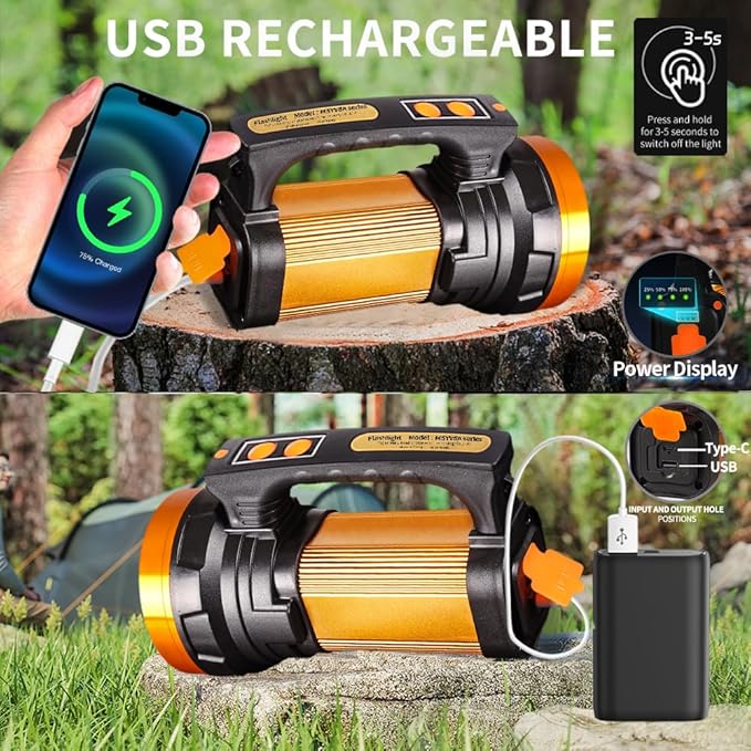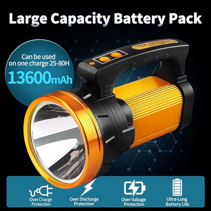 - Rechargeable Handheld Spotlight Flashlight :The High Powered Rechargeable effortlessly illuminates an entire room,Built-in 13600mAh Achieve ultra-long range,The high lumens spotlight flashlight high lumen Max ran 5000FT /60000inlarge-capacity battery pack, Rechargeable spotlights Easily follow the animals on the farm,let you walk in the dark without fear.