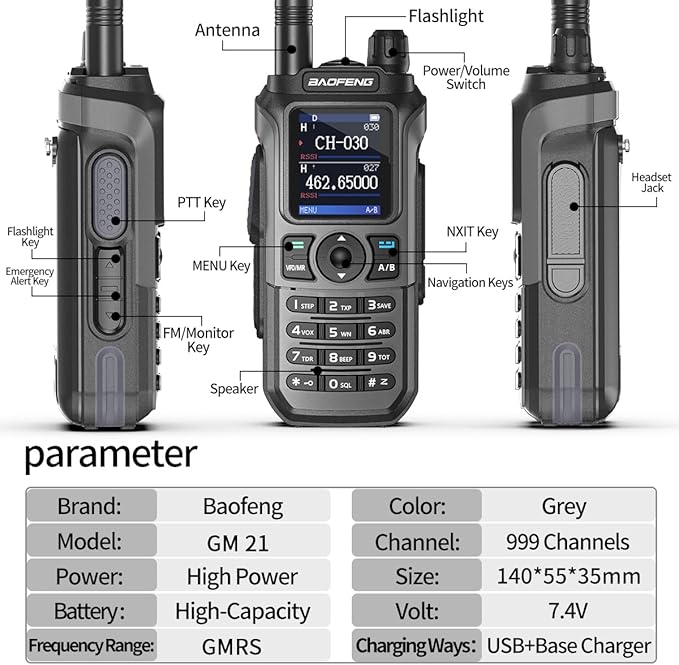 - 💪【Professional GMRS Ham Radio】The walkie talkie can reach the highest output power level of GMRS handhelds , which will help to get stronger signals and reach longer distances. VOX function can achieve hands-free operation while driving. It is comes with 30 GMRS channels and 10 NOAA weather channels, compatible with FM/UHF/220-260MHz/VHF(only receive), providing comprehensive communication options. FCC ID: 2AJGM-GM21. Support Chirp (Compatible programming software: GM-5RH).