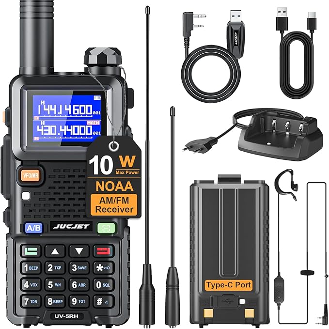 5RH Ham Long Rang Walkie Talkies 10W (Upgraded of UV-5R), 999CH One Key Frequency Match, 2500mAh Battery Rechargeable Walkie Talkies, with Programming Cable, Earpiece, Type-C Charging(1 Pack)