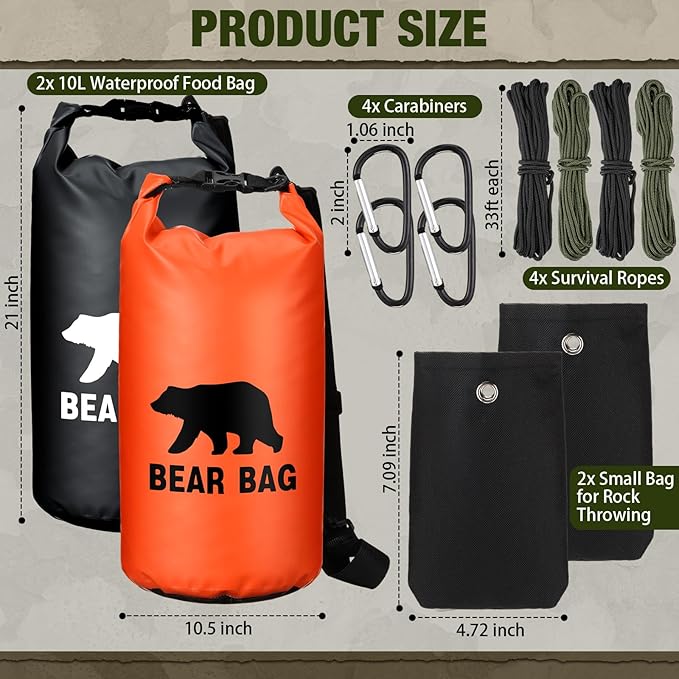 - Bear Food Bag Hanging System: includes 2 bear food bags respectively in black and orange, 4 sturdy nylon ropes in 2 colors, namely black and army green, 4 clips in black, and 2 rock pouches in black; The package ensures you have everything you need for a convenient and efficient setup