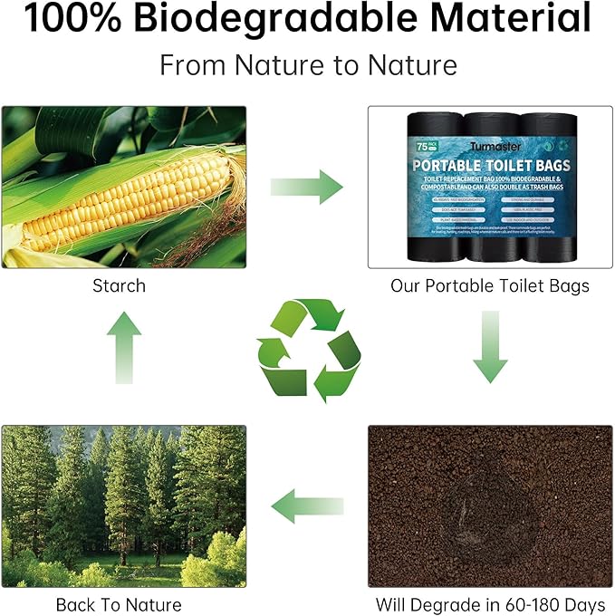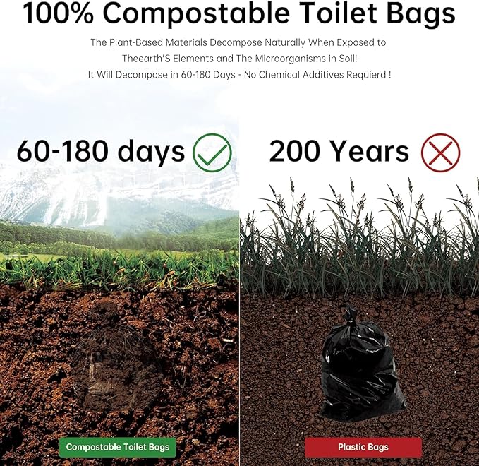 - Reliable to Use: our portable toilet bags are made of quality plant materials, which are safe and reliable, light but sturdy, no bad smell and not easy to break, It takes about 30-180 days for this toilet bag to be degraded in the soil, only with water and carbon dioxide remains. so you can use them with confidence