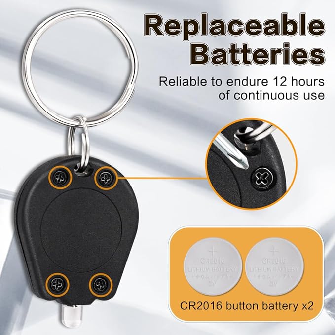 - Replaceable CR2016 Batteries: The mini keychain flashlight is installed TWO CR2016 batteries, usually it gives you up to 12 hours of continuous use. You can replace the new batteries easily by user manual.