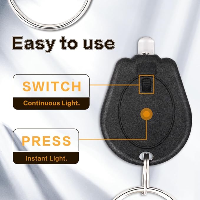 - Two Easy Use Methods: (1)Instant Key Light: Slightly pinch the middle of the red keychain flashlights with your two fingers to activate instant red light; (2)Continuous Light: Slide the On/Off Switch to turn on or turn off the mini red light keychain flashlight.