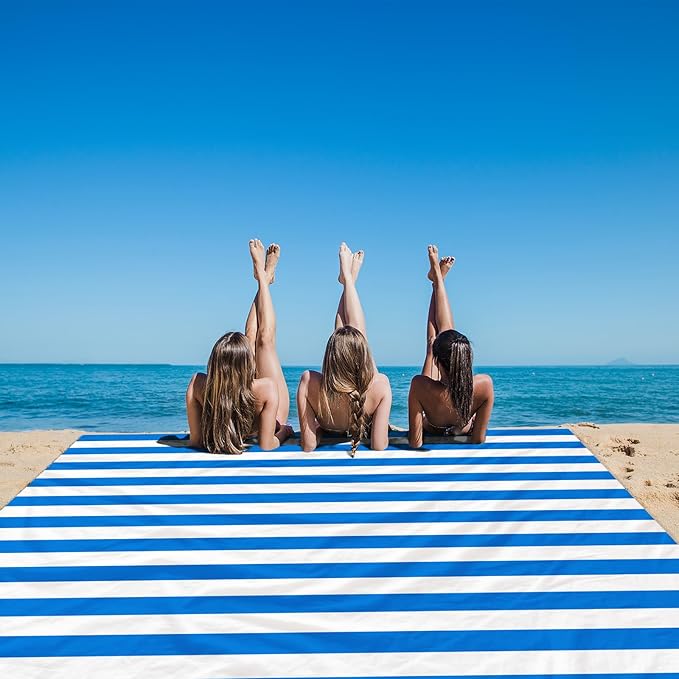Blue Stripe Beach Blanket Sandproof Waterproof, Extra Large 78"×86" Beach Mat for 1-4 Adults w/Stake & Pocket,Compact Lightweight Sand Free Picnic Mat Beach Essential-Ultra Marine
