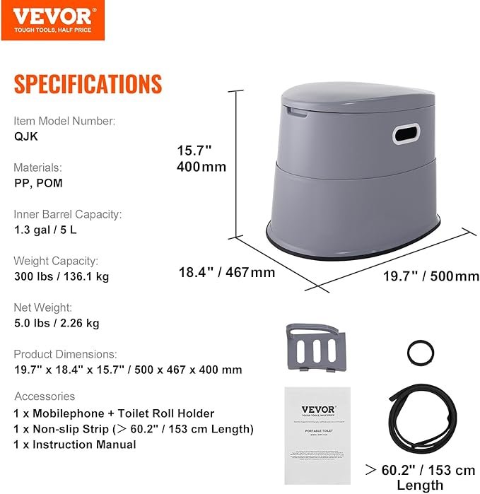 - Non-slip Structure: This travel toilet features a wide and comfortable seat, measuring 19.7" x 18.4" x 15.7" (500 x 467 x 400 mm), providing greater comfort for adults. The portable potty's sturdy structure supports a weight capacity of up to 300 lbs (136.1 kg). The base is fitted with non-slip strips, ensuring good stability and preventing slipping.