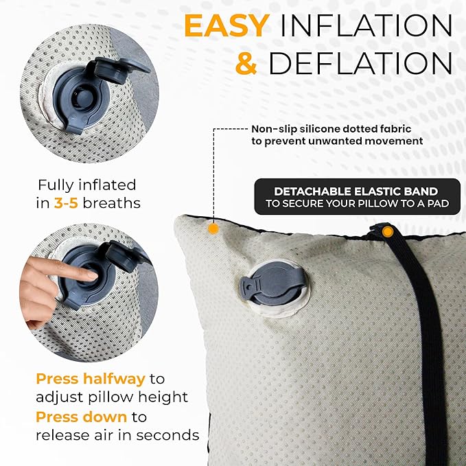 - Upgrades: The removable strap and non-slip silicone dots with keep your camp pillow in place all night long. With a unique adjustable valve, you can adjust the packable pillow height with one click!