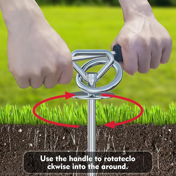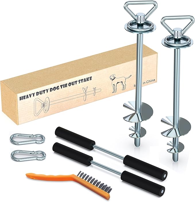 - EASY TO INSTALL:the heavy-duty dog lashing pile is designed with auger bits and curved blades, so you only need to rotate it a few times easily. The sharp, curved double blades will slide effortlessly through the soil and drop it into any ground. The built-in soft handle stainless steel rod is easy to carry and can be easily screwed to the pile