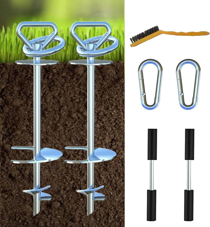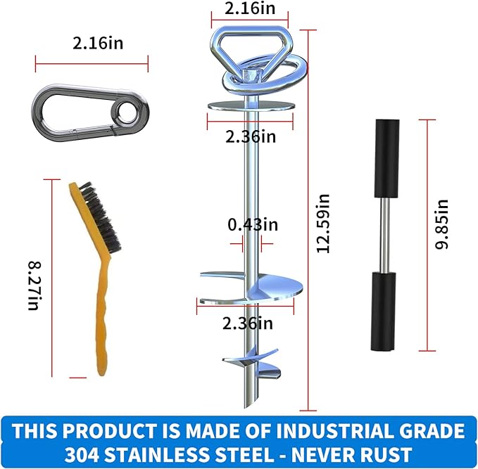 - YOU WILL RECEIVE: 2 heavy duty screw-in ground anchor made of 304 stainless steel. 2pack Stainless Steel Carabiner,1 packs of brushes,2 stainless steel pole with soft handle,1 manual. It really is the perfect dog camping leash gear Accessories and is very portable