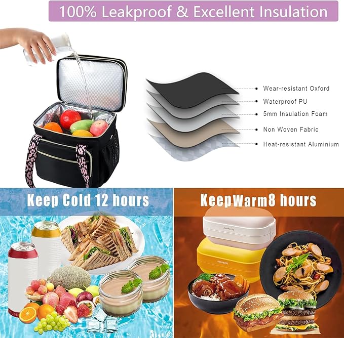 - 【Thermal & Leak-proof & Insulation】Lunch bag lining is made of high-density insulating material and heat-pressing technology to ensure insulation and leakproof, can keep food hot/cold for 8-12 hours, putting ice cubes on it will keep you enjoying a day of refreshing.