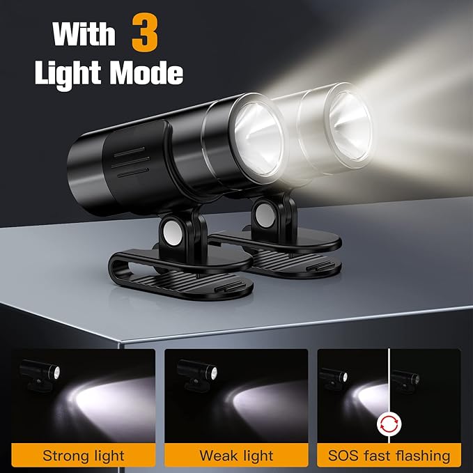 Waterproof Clip on Flashlight 2 Packs,Super Bright LED Rechargeable Night Running Lights,Suitable for Use with Headlights for Camping,Maintenance,Night Fishing,Jogging and Dog Walking