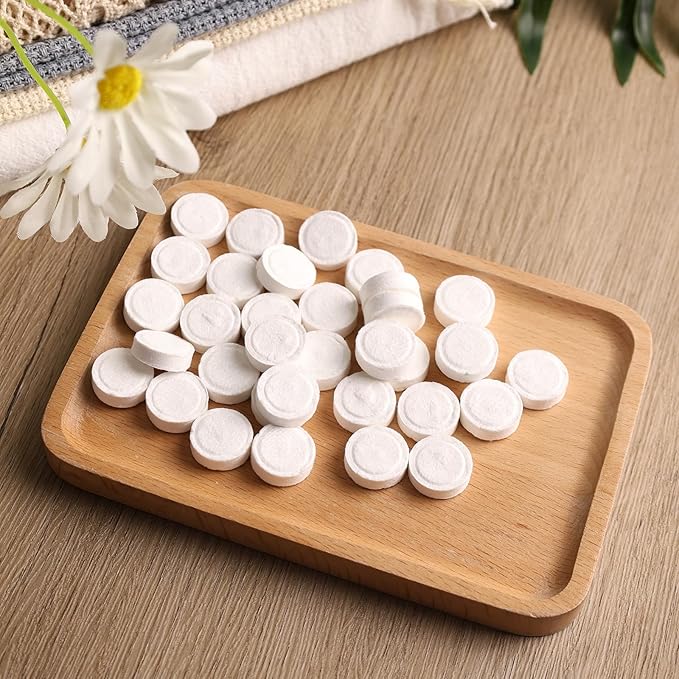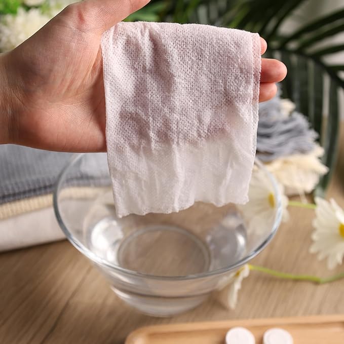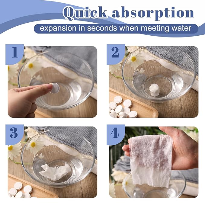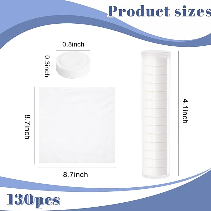 - PORTABLE DESIGN - Each of our compressed towel tablets measures 0.8 x 0.3 inches, expanding to 8.7 x 8.7 inches when in contact with water. Compact and practical, our compressed towels are ideal for on-the-go use.