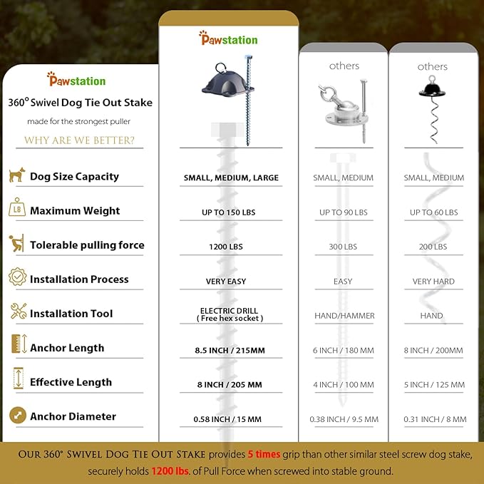 - Patented 360° Swivel Dog Tie Out Stake Dog Anchor for Small to Large Dogs Up to 150lbs - Dog Yard Leash Stake with 5 Strong Tether Holds 1000lbs of Pull Force