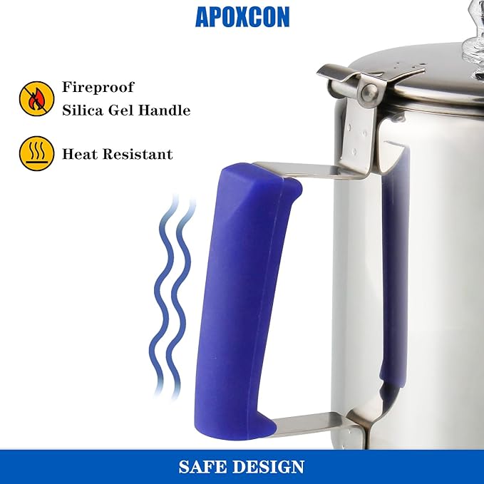 - 【EASY TO USE】 This coffee pot features a drip-free spout and wide hinged lid, making it very easy and safe to use. The blue silica gel handle provides a comfortable grip and stays cool to the touch for easy pouring.