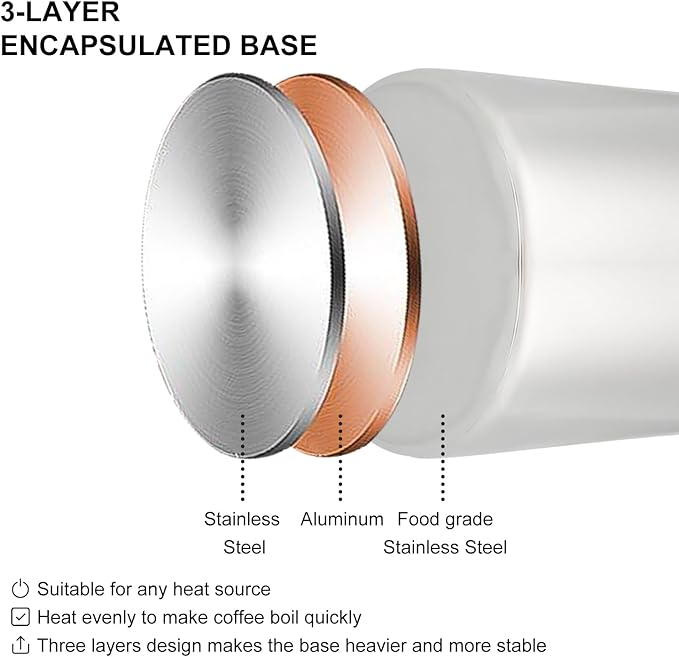 - 【NO ALUMINUM OR PLASTIC】 The percolator coffee pot body, cover and filter basket are made of quality 18/8 (SS304) stainless steel, which allows it to withstand drops and impacts during use. No aluminum and plastic, toxin free and corrosion-resistant. It is easy to clean and maintain and will last for years.