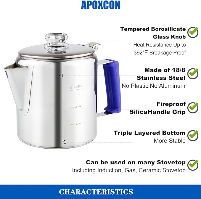 - 【OUTDOOR AND INDOOR USE】 This coffee percolator is designed for outdoor and indoor use. It’s suitable for induction cooker, ceramic electric stovetop and gas stovetop, as well as grills and campfires.