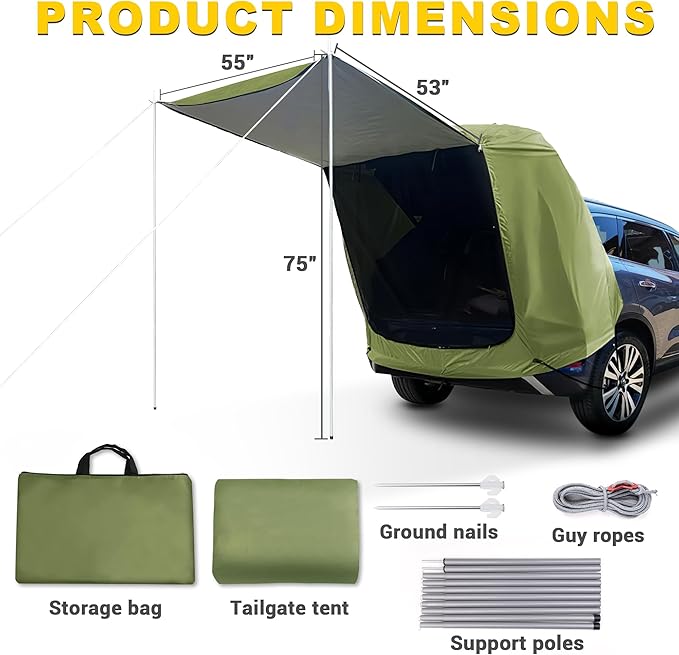 - Ultimate Comfort and Privacy: Enjoy optimal ventilation and bug protection with our dual-layer design. The outer zipped cover provides privacy, while the inner mesh screen keeps bugs out. Plus, it comes with 2 support poles for setting up an awning, providing extra space for tailgate gatherings.