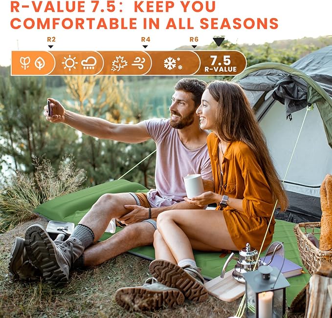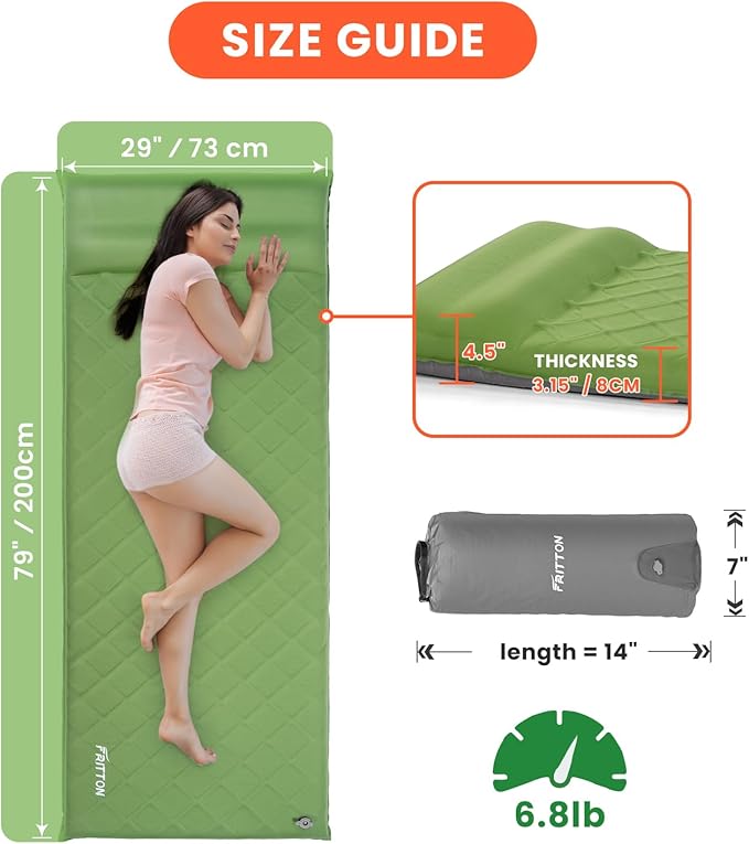 - FIT FOR ALL SEASONS: FRITTON insulated inflatable sleeping pad for camping has an R-value of up to 7.5, which ensures superior insulation all year round. Warm in winter and cool in summer, suitable for all seasons. Whether you're ready to embark on a winter adventure or planning a comfortable spring camping, this self-inflating sleeping mats for camping are a must-have accessory for every outdoor enthusiast.