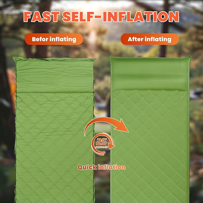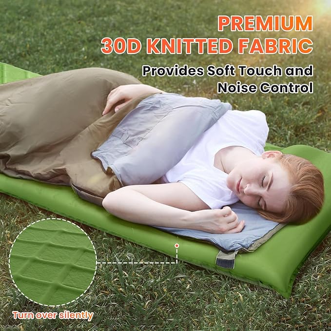 - SILENT SLEEPING SURFACE: The self inflating sleeping pad is made of 30D knitted fabric, which can effectively absorb noise to ensure that your rolling over and movements will not disturb you and your partner's sleep, keeping you comfortable and quiet all night long. At the same time, the knitted fabric is soft and skin-friendly, but also breathable, heat-insulating and tear-proof, more wear-resistant and elastic than nylon fabrics on the market.