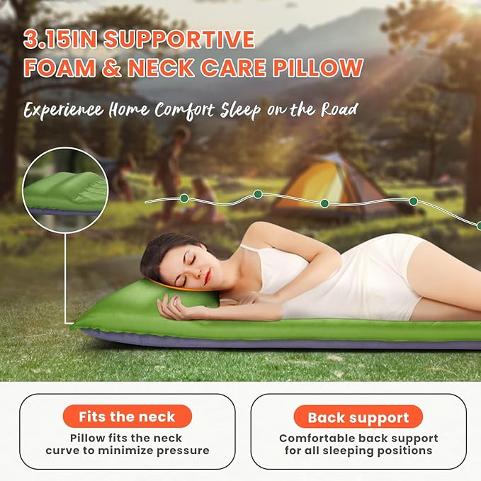 - MAXIMUM COMFORT: This camping mat has a thickness of 3.15 inches and a weight capacity of up to 660 lbs. The internal 19D high resilience foam provides firm support, and the unique rhombic structure of the foam ensures that air is evenly distributed throughout the camping pad, dispersing the weight and effectively reducing pressure points. Besides, Our outdoor camping mat includes a built-in pillow, designed to cradle your neck for a restful night's sleep.