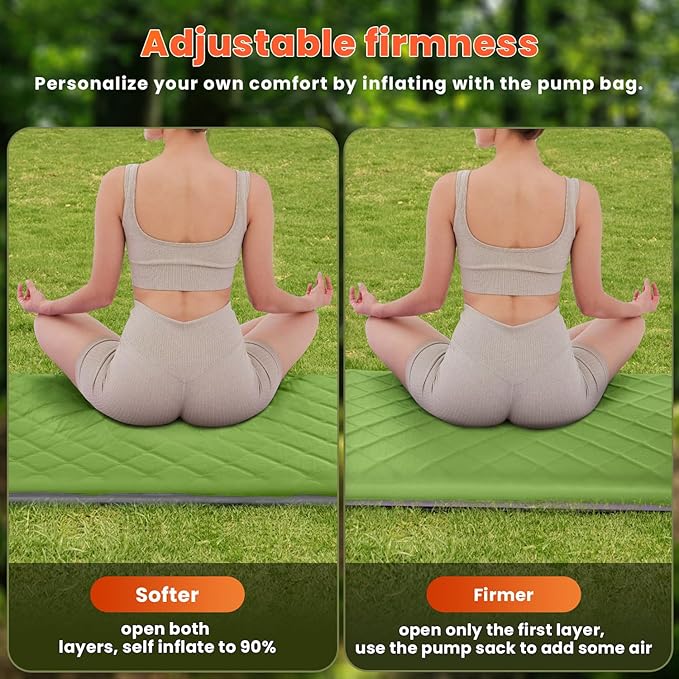 - 25S FAST SELF-INFLATION: The camping mat is very easy to inflate, just open both layers of the valves and unfold the camping mattress, the air will fill the pad within 25 seconds. In addition, each sleep pad comes with an additional pump sack, which can be used to adjust the softness or firmness of the pad for a best sleep experience. Meanwhile, 19D foam's high resilience ensures that the sleeping mat will not lose elasticity after prolonged use.