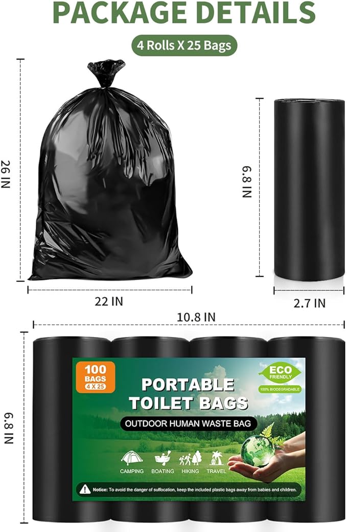 - 𝐏𝐎𝐑𝐓𝐀𝐁𝐋𝐄 & 𝐌𝐔𝐋𝐓𝐈𝐏𝐔𝐑𝐏𝐎𝐒𝐄 - Our camping toilet bags come in Convenient Rolls that are easy to carry and store. Whether you're camping, traveling, boat or just need a reliable compost bag for your home, our biodegradable garbage bags are the perfect solution. Use them for camping toilet seat, kitchen waste, portable toilet for adults, portable camping toilet, rv toilet, cat litter bags and more. With 100pcs compost toilet bag in each pack, you'll have plenty for all your waste disposal needs.