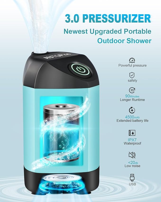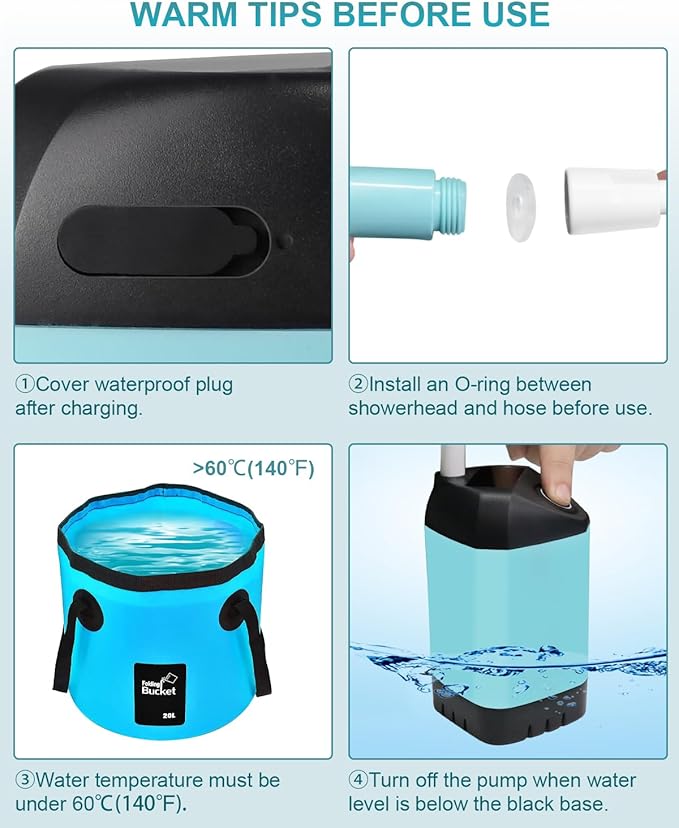 - [LONG BATTERY LIFE FOR OUTDOOR & IPX7 WATERPROOF]--With powerful and environmental lithium battery, fully charged need 3-5 hours and used continuously for about 90-110 minutes. Featuring internal rubber injection waterproof system, the portable shower pump prevent water leakage reliably, for a hassle-free and safe showering experience.