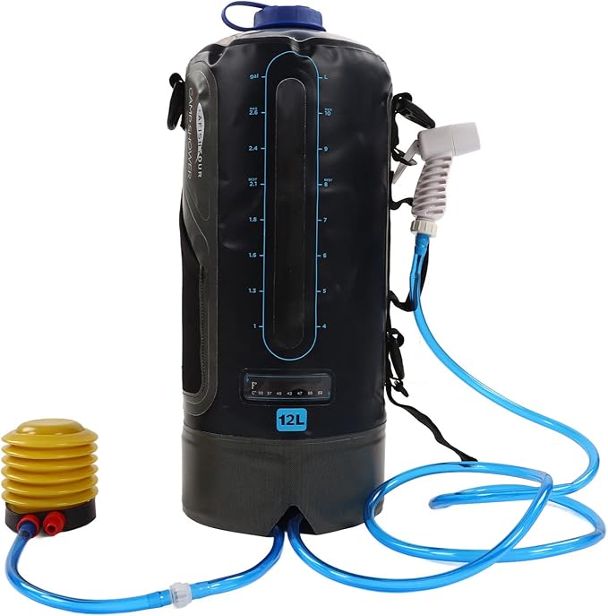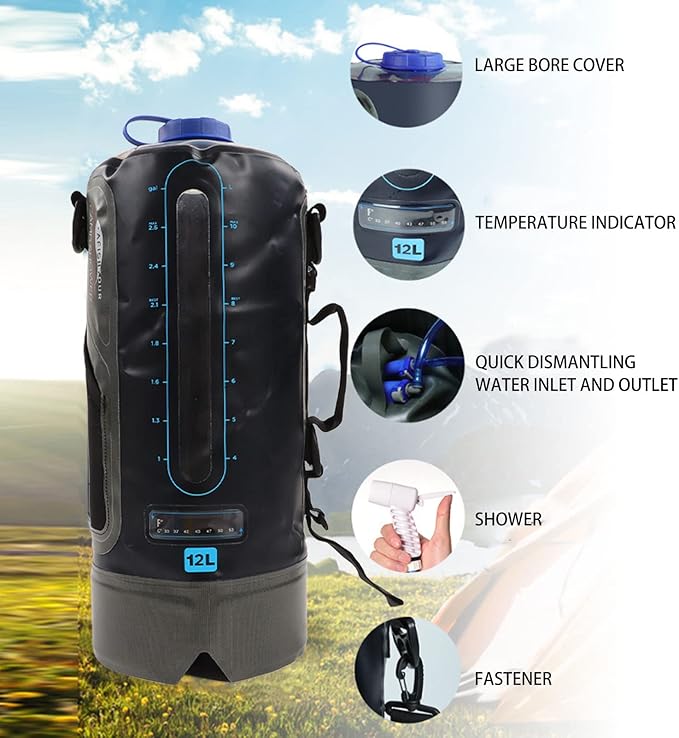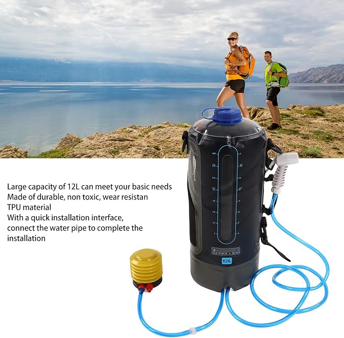 - LARGE CAPACITY: This portable shower boasts a generous 12-liter capacity, ensuring it meets your essential water needs. Whether you're engaged in outdoor activities, hiking, or camping, it guarantees an ample water supply