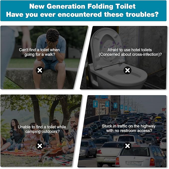 - 🚽【Convenient Assembly and Waste Disposal】This porta potty for adults offers easy assembly, with installation or folding taking just 30 to 60 seconds—perfect for quick use in emergency situations. Additionally, it comes with biodegradable waste disposal bags that naturally degrade in about 180 days. With a strong load-bearing capacity, it can withstand approximately 5-6kg of garbage. Moreover, it's highly portable, allowing you to easily transport it in your car, luggage, or backpack!