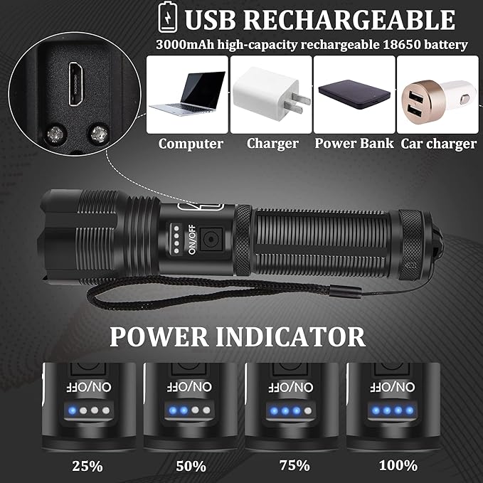 - [USB Rechargeable] This rechargeable flashlight uses a 3000mAh rechargeable lithium battery, Flashlight use for a longer time. The tactical flashlights has 4 blue indicator lights: 100%-75%-50%-25%, which allows you to charge flashlights in time.