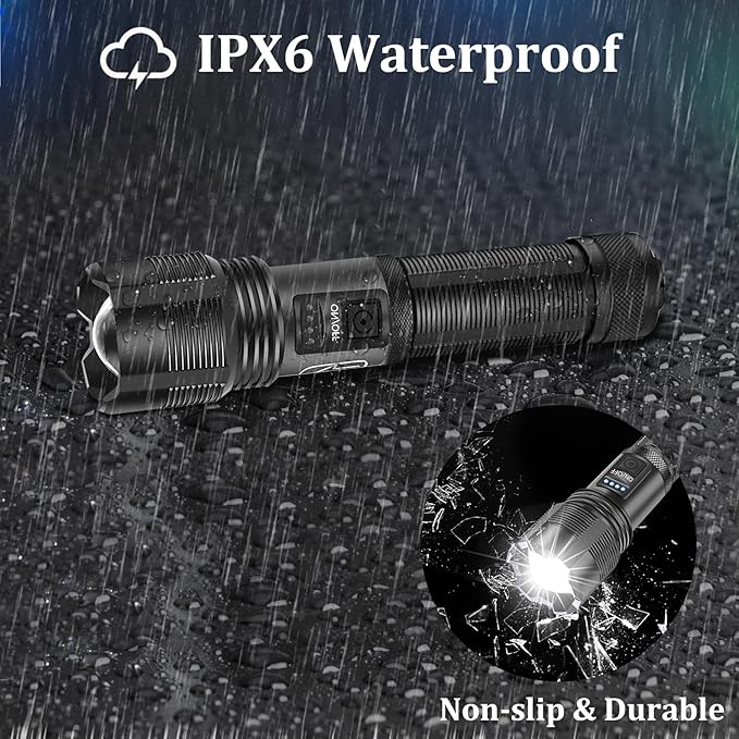 - [Tactical Flashlights] The flashlight is made of super hard aluminum alloy, which makes flashlight wear-resistant, drop-resistant amd Sturdy. IPX6 waterproof flashlight can withstand extreme conditions such as storms.