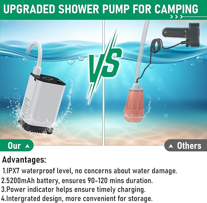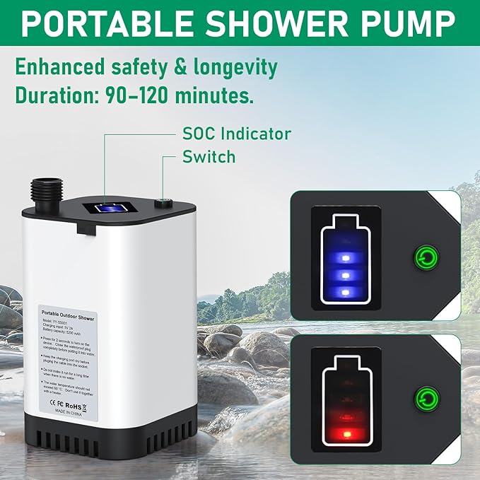 - High Performance Pump - Powered by a robust 5200mAh battery, our travel shower pump delivers up to 120 minutes of continuous operation. With a USB cord, it can easily connect to a mobile power source, laptop, or car USB output. Designed for the outdoors, it features a waterproof cap for safe and reliable performance in any environment.The LED display on this portable water pump gives you a clear view of the power status.