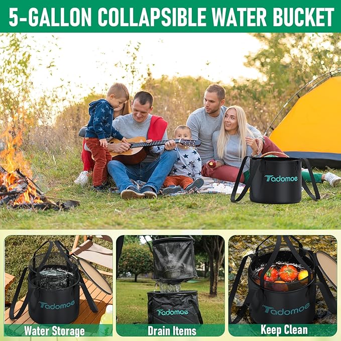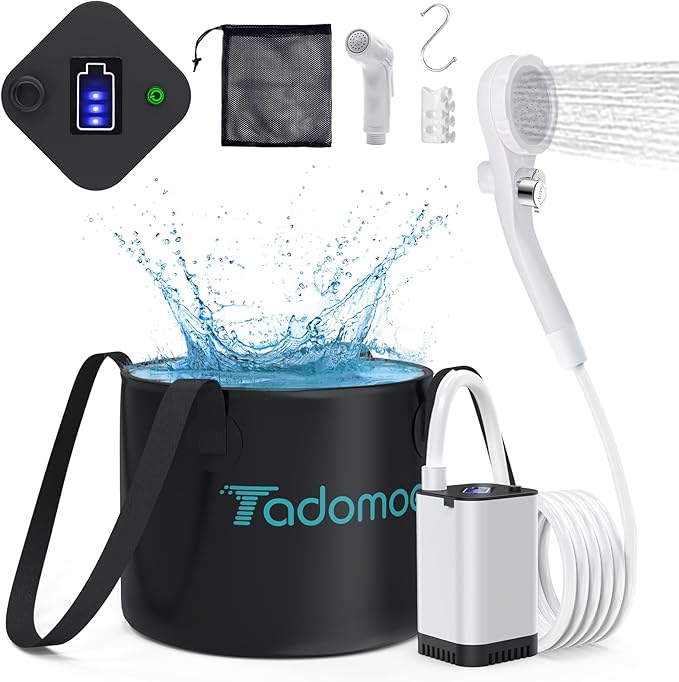 - Upgraded Shower Pump - This portable camping shower features a reliable, durable, and quiet motor, ensuring a peaceful outdoor shower experience. Its bottom suction design, with four sturdy suction feet,firmly anchors the bucket underwater.The water bucket is equipped with a mesh organizer bag,effectively prevents mud, dust, and other impurities from the water, helping to prevent skin issues and making cleanup a breeze.