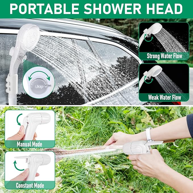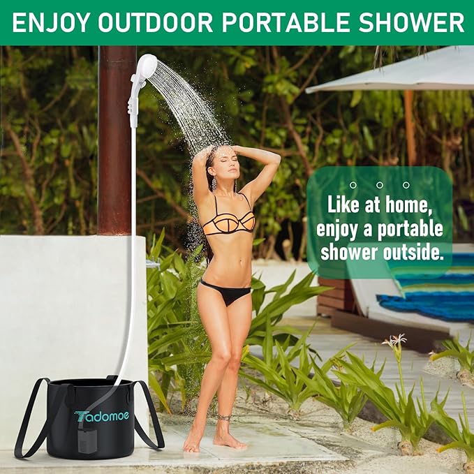 - Package Content - This comprehensive camping shower kit includes everything you need: 1x shower head, 1x spray nozzle,1x powerful shower pump, 1x 6.7ft water pipe, 1x 5-gallon foldable bucket, 1x hook, 1x Charging cable. It's the perfect solution for indoor and outdoor showers, camping, BBQs, hiking, beach trips, pet baths, car washing, plant watering, and more.